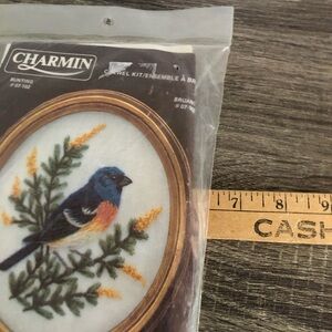 Charmin crewel kit featuring a bunting bird design. Includes yarn in vibrant colours, a printed design background and a frame to finish it off.