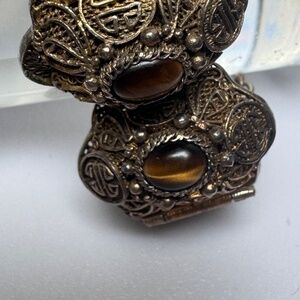 Vtg Chinese Export Bracelet Tiger's Eye Cabochon Silver Gilded Vermeil Filigree
