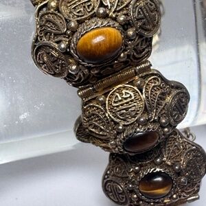 Vintage Chinese export bracelet , featuring intricate filigree designs and tiger's eye cabochon. Consists of 10 panels, marked silver GUR on the secure clasp with safety chain.