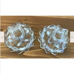 Set of 2 clear star & bubble glass candle holders made in Reims, France for Abbott in style "Fortunio". Candle holders are 3 1/2" across x 2" tall. Excellent pre-owned condition, includes original box.