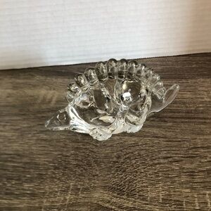 Elegant clear glass dinosaur paperweight. Perfect for decor or collection. Clear pressed glass dinosaur. Not recommended for children. Art glass decor or paperweight (unsure of its intended purpose). Super cute gift idea for the dinosaur lover in your life! Highly polished bottom, unsigned.