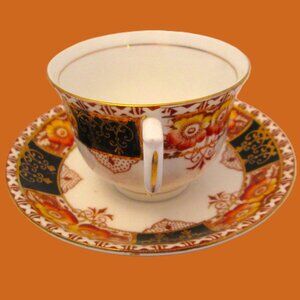 Vintage that borders on antique Colclough China cerca 1930s Imari style of bone china cup and saucer of rich golds, black, orange & yellow that mirror the richness of colour in each other. A quality design that is desirable for the festive season of fall and all that represents of celebrating a Thanksgiving of what we have had and look forward to having. Colclough bone china teacup is a very desirable set to have to share with others as a gift or sharing some time with conversation and a cup of hot tea in elegant fashion.