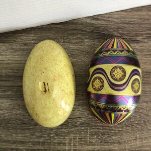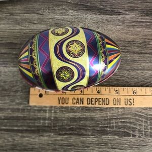 Vibrant decorative egg with intricate patterns. Features yellow, purple, and green designs. Jellybean pattern inside. Made from a light metal.