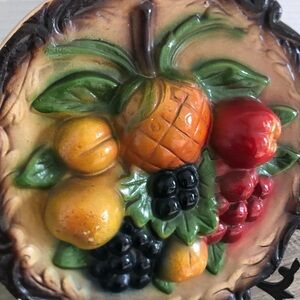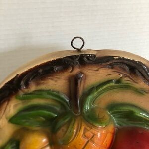 Decorative wall plaque featuring vibrant fruit design. Perfect for adding a pop of colour to any room. Lovely painted Chalkware piece dating to the 50’s or 60’s. Approximately 12” round.