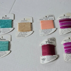 New old stock crafting string. Listing includes all seven pictured: two teal patina, one beige patina, two purple sparkly crystal rays, one salmon flair and one burgundy flair. Some are made in the US and the others are England. Crystal rays are 5 yards, flair is 10 yards, and patina is 15 yards I believe.