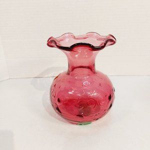 Vtg Cranberry Art Glass Vase Ruffled Edges Heart Swirl Pattern 5.5"