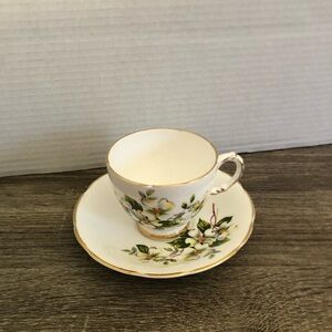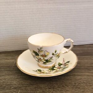 Gorgeous white floral design. Bone china teacup and saucer made in England by Delphine.