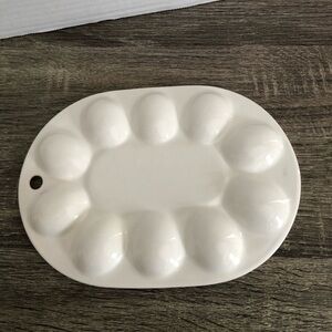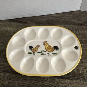 Cute oval ceramic dish for deviled eggs. Chickens in the middle. Very kitchy and retro. Yellow boarder.