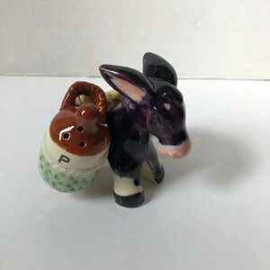 Cute little ceramic donkey with two (saddle/cloth/woven?) baskets/jugs? one is salt the other pepper. My best guess based on the stoppers and the marking on the bottom that this was likely made in Japan around the 1940’s. It’s hard to pinpoint exactly without a manufacturer mark.