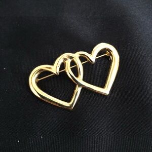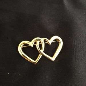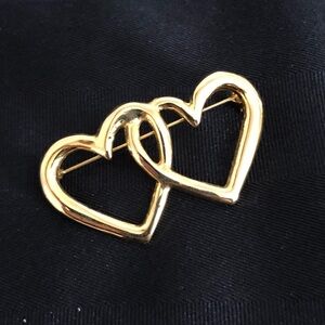 Lovely gold-tone brooch. Features two intertwined hearts. Perfect for adding a touch of romance to any outfit. Cute addition to a Valentine’s Day outfit!
