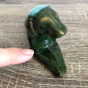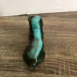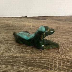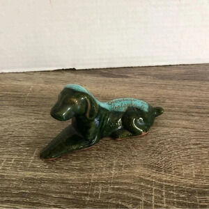 Cute redware dog with a green and teal drip glaze finish. Souvenir piece from Heritage park in Calgary.