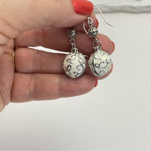 Filigree & Enamelled White Silver tone earrings. These have some weight. See pictures. I changed out hooks for newer. Unknown metals, unmarked. Great condition!