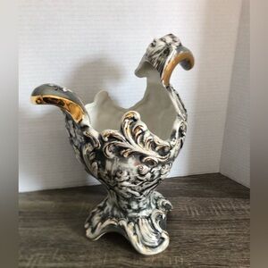 This lovely ceramic vase features intricate designs of cherubs in cream, gold and grey. Perfect for adding a touch of elegance to any room. Made in Portugal by ELPA Alcobaca. Gorgeous hand painted designs.