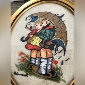 Charming vintage embroidered wall art featuring a couple of children under an umbrella. Set in a gold oval frame. Perfect for adding a nostalgic touch to any room. Hand stitched. Name on the back is Helen Fox, undated. Would be perfect in a kids room.