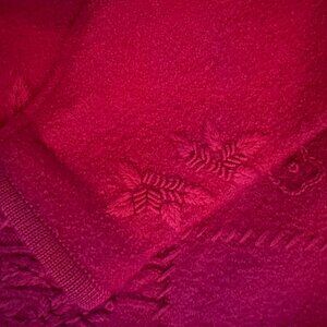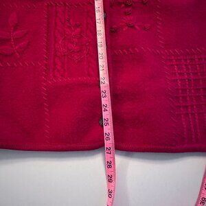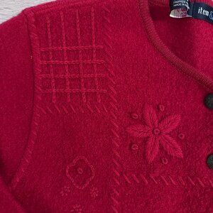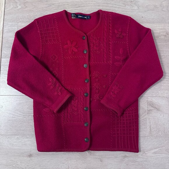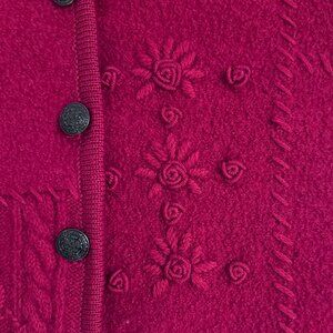 Vintage Women's boiled wool, embroidered , Cardigan, Lady Jacket/Sweater with metal buttons, beautiful floral details in deep Raspberry