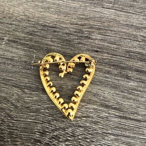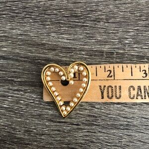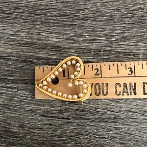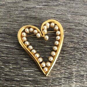 Cute goldtone heart shaped brooch adorned with dainty faux pearls. I believe this is an older piece because the pin sticks out past the edge of the brooch, more often seen in older brooches. Adorable addition to a Valentines Day outfit.