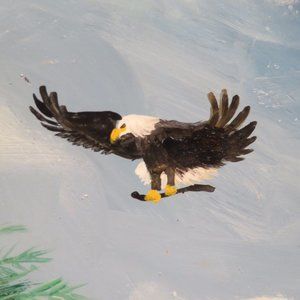 set against a blue sky, mountains and fluffy clouds, the other eagle