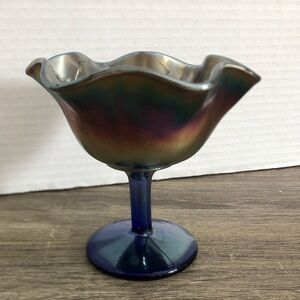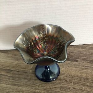 This stunning iridescent art glass bowl features a beautiful holly design. The shimmering colors add a touch of elegance to any home decor. Cobalt blue with a carnival glass iridescence. Conflicting dates on the internet as to when this was produced. Some claim as early as 1910. Some claim this pattern dates to the 1930s. Either way it’s either vintage or antique.