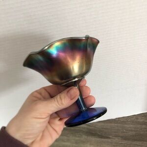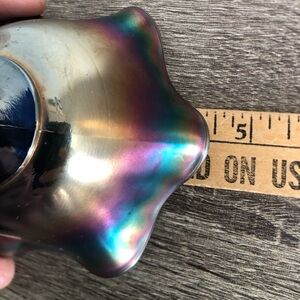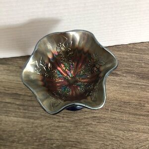 This stunning iridescent art glass bowl features a beautiful holly design. The shimmering colors add a touch of elegance to any home decor. Cobalt blue with a carnival glass iridescence. Conflicting dates on the internet as to when this was produced. Some claim as early as 1910. Some claim this pattern dates to the 1930s. Either way it’s either vintage or antique.