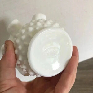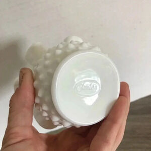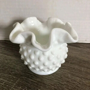 Stunning milk glass vase with a ruffle edge and hobnail detailing. Just a cute little bud vase overall great for any decor!