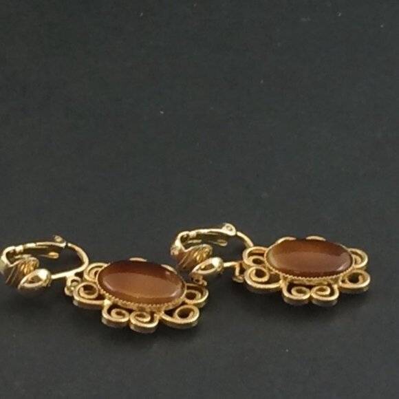 Vtg Filigree Faux Brown Tiger Eye Clip On Earrings Celebrity Gold Tone Danglers