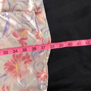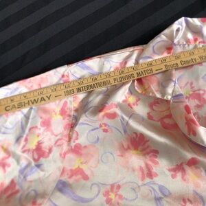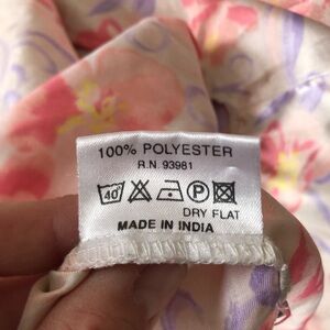 Stylish floral sleep shirt with a vibrant design. Cream background with pink and purple florals and hints of yellow. 100% Polyester. Made in India. Size unknown- tag worn off. Likely an XL or so.