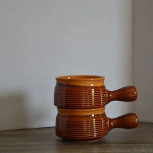 Two brown drip glaze French Onion Soup bowls. Traditional MCM style.