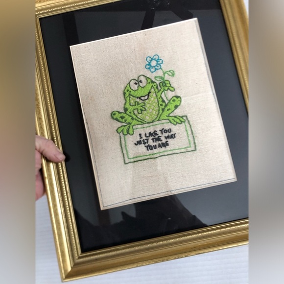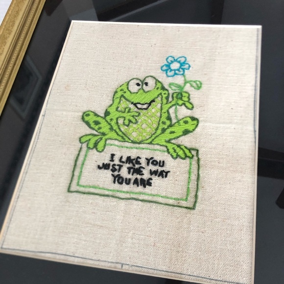 Charming hand stitched frog embroidery with a playful message. Set in a sleek gold frame. Perfect for adding a whimsical touch to any room. Perfect gift idea for the frog lover in your life.