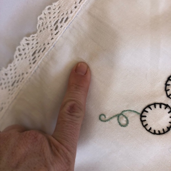 Gorgeous hand stitched fruit on each corner, hand stitched lace edge.