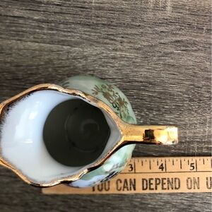 This exquisite ceramic pitcher and saucer set features a beautiful green iridescent base with luxurious gold accents. Gorgeous Victorian courtyard designs on each piece.