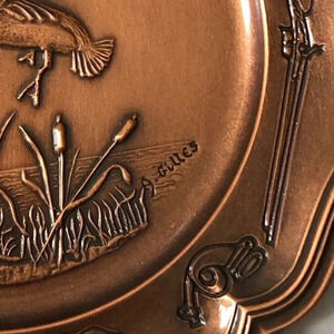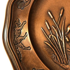 Stunning 3D artwork from Gilbert Giles made in Quebec I believe. Pictorial of a goose flying out from some pussywillows. Boarder appears to be a variety of wolves, guns, horns?, and some other object maybe bullets of some sort. I presume this is a goose hunting plate. Perfect gift for the hunter in your life!