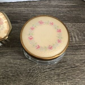 Elegant vintage brush and jar set with a gold finish. Features a charming floral design.