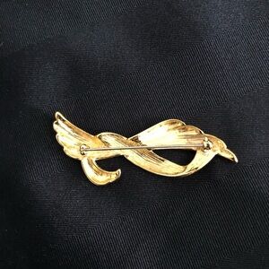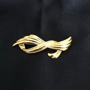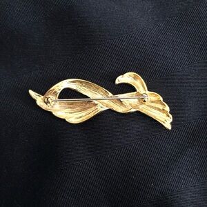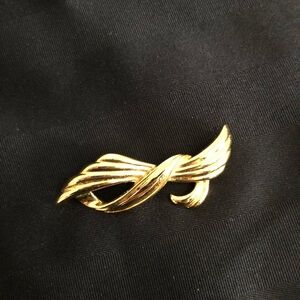 Cute gold tone brooch. Features an abstract design. Perfect for adding a touch of sophistication to any outfit!