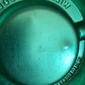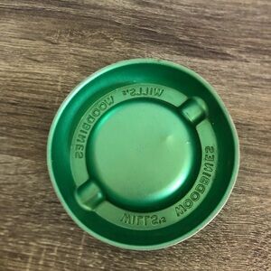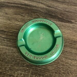 Vintage green metal ashtray with Wills's Woodbines branding. Perfect for collectors.
