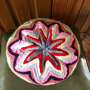 Add a vibrant touch to your home with this multicolour knit pouf pillow. Perfect for any room, it combines style and comfort effortlessly. Cottage/grannycore and boho vibes.