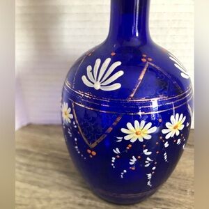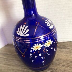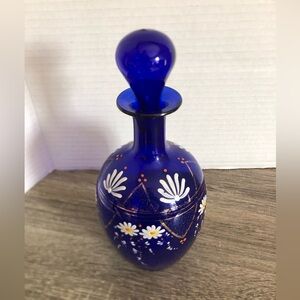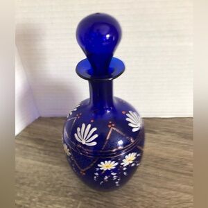 Elegant cobalt blue glass decanter featuring a delicate hand painted floral design. Handblown glass decanter and stopper. The stopper is hollow and is hand ground to fit the bottle (there’s one spot that looks like a large chip but I think it’s actually from when they were fitting the stopper to the bottle). The stopper does have a couple tiny chips on the bottom edge which sits inside the bottle itself. Bottle is marked “66” on the bottom so I presume it was made in 1966, but I am not 100% certain. Likely bohemian based on the style.
