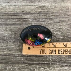Beautiful hand painted egg with vibrant floral design. Features red, pink, yellow, and blue flowers on a black background. I believe this may be a real egg that has been lacquered after painting but I am not an expert. Signed by the artist.