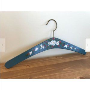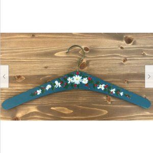 Wooden clothes hanger has pretty hand painted design of white daisies with holly berries. Standard (adult) hanger size, 16" long x 9" tall.