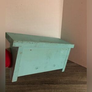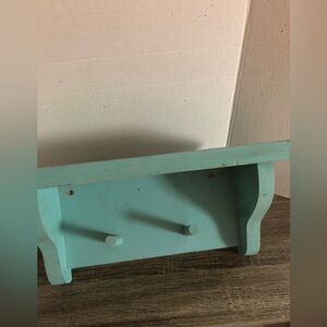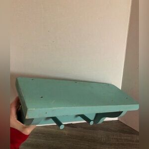 Rustic baby blue shelf. Solid hardwood. Lovely wear and signs of previous use but that’s what makes it so special. This shelf may actually be older but there is no way to know as there are no markings. This would be perfect for the cottage, a coastal themed bathroom, a kids bedroom, and more!