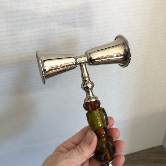 Elegant silver double shot glass with amber and brown glass beaded handle. Perfect for adding a touch of sophistication to any bar. Classic Mad Men style bar tool. Perfect gift idea for the bar lover in your life!