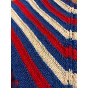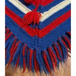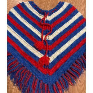 Vtg Handmade Knitted Childs Poncho With Fringe Trim Bold Stripes Red White Blue