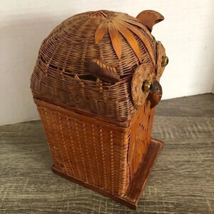 Adorable little box, handcrafted with woven wood. Has a plastic sort of eyeballs and wooden ears and beak. There is one large-ish spot on his one side that is damaged but if he is just going to sit on a shelf you likely wouldn’t notice. Other than that he is in good shape. The lid doesn’t come off too easily but it does come off if you wish.