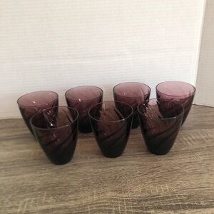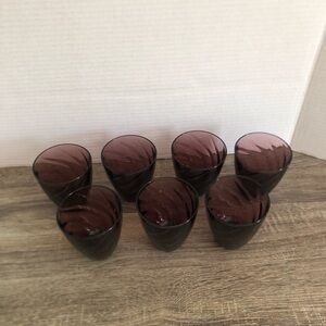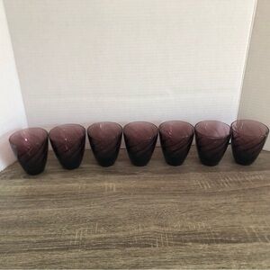 Add a touch of elegance to your home with these beautiful amethyst glass juice cups. Perfect for creating a warm and inviting atmosphere. Optic swirl design. Made by Hazel Atlas in the 50’s or 60’s I believe. Listing includes a total of seven glasses.