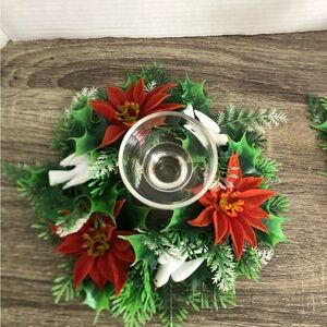 Clear glass pedestal candle holder with a lovely wreath of greens on the bottom. Features poinsettias and flocked doves. Made in Thailand.