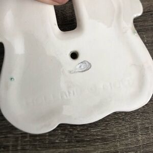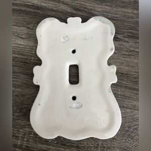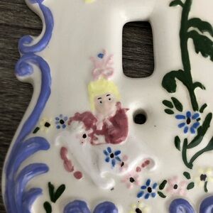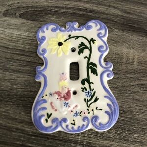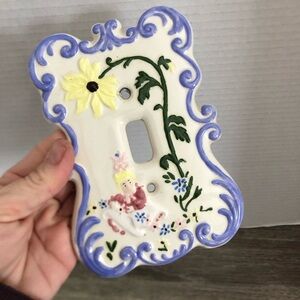 Beautiful ceramic light switch cover with floral design. Features blue (bit purple) border, a large butter yellow, and green flower and a little girl dressed in pink accents.