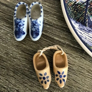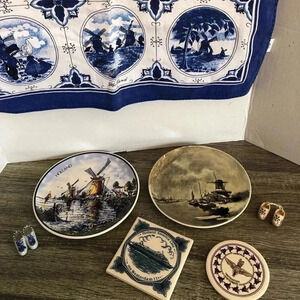 Lovely holland bundle with a total of seven items. Listing includes a delft labelled plate (7 6/8” across), another hand painted plate with writing on the back but I cannot determine what it says (7” across”), two mini pairs of ceramic clogs, a tea towel (19 3/4” x 26”), and two ceramic coasters. As is condition- please view photos prior to purchase as the one plate does have condition issues.