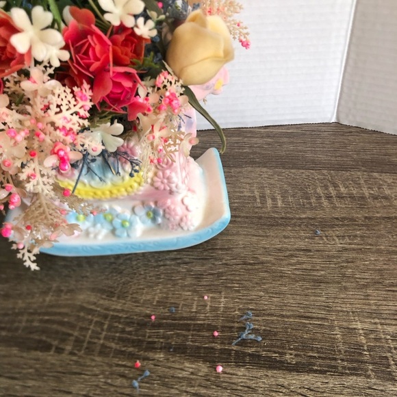 Charming faux floral arrangement featuring a pink rocking horse Inarco planter. Includes a mix of colorful flowers. Made in Japan. Likely dates to the 60’s.