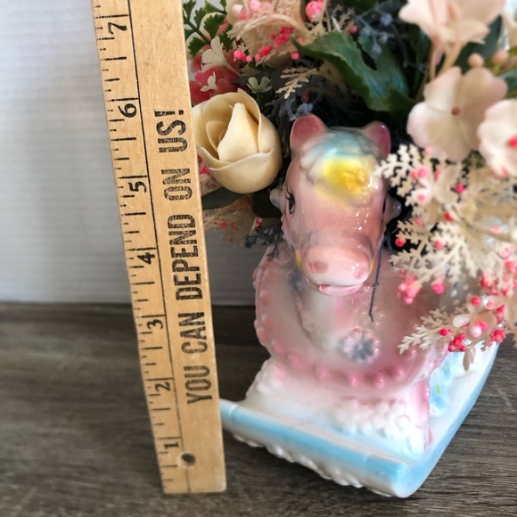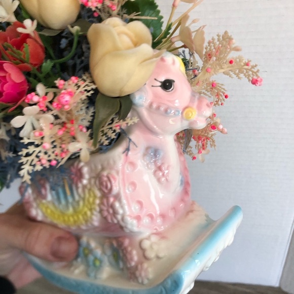 Vtg Inarco Pink Rocking Horse Planter with Faux Florals