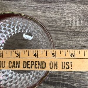 Elegant Indiana Glass bowl with a striking ruby red scalloped rim. Features a classic diamond pattern. Perfect for serving or display. Three feet on the bottom.