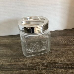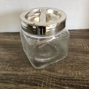 Square shaped glass jar with plastic silver coloured lid. Made in Italy by borgonovo Italy. Holds 3 1/2 litres.